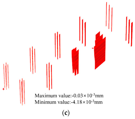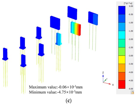 Displacement contour nap of pile foundations at the final excavation stage. (a) Displacement contour map of pile foundations in the x-axis direction. (b) Displacement contour map of pile foundations in the y-axis direction. (c) Displacement contour map of pile foundations in the x-axis direction.