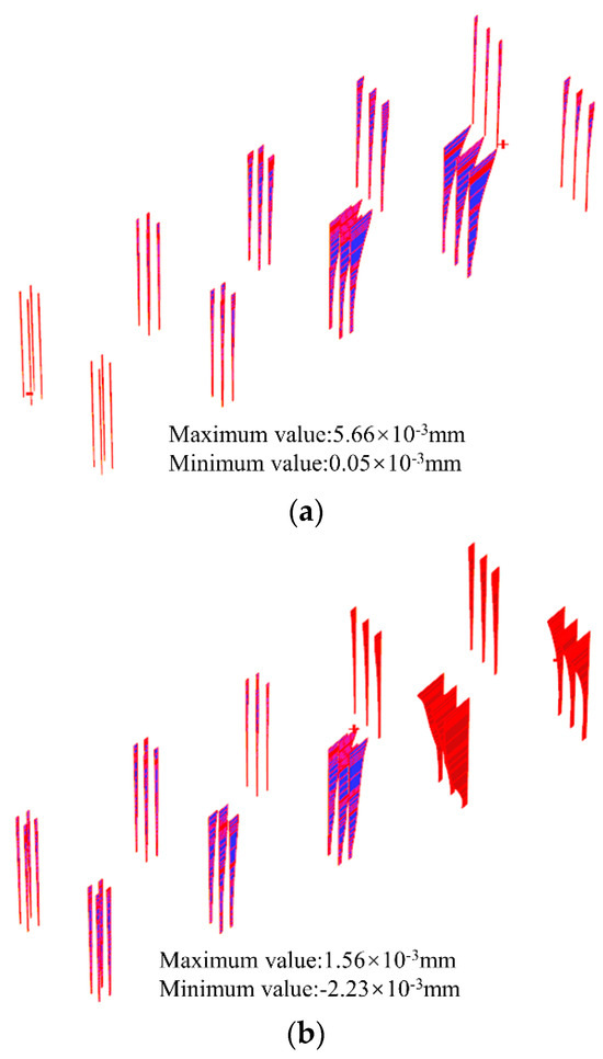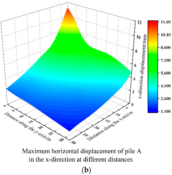 A calculation interval of 4 m was established in both the x- and y-axis directions from the foundation pit to analyze the impact of pit excavation on the adjacent elevated bridge. In the x-axis direction (perpendicular to the foundation pit), a total of eight calculation conditions were set, while in the y-axis direction (parallel to the foundation pit), a total of nine calculation conditions were set for each row. This resulted in a total of 72 different distance calculation conditions. The maximum displacements of piers and pile foundations in the x-, y-, and z-axis directions under different conditions were extracted, and their respective displacement nephograms are presented in Figure 18, Figure 19, and Figure 20, respectively.