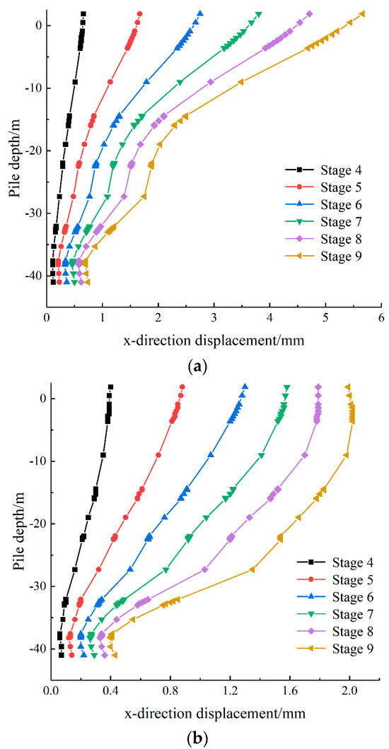 Horizontal displacement of Pile Foundation A under different excavation conditions. (a) Horizontal displacement of Pile Foundation A in the x-axis direction. (b) Horizontal displacement of Pile Foundation A in the y-axis direction.