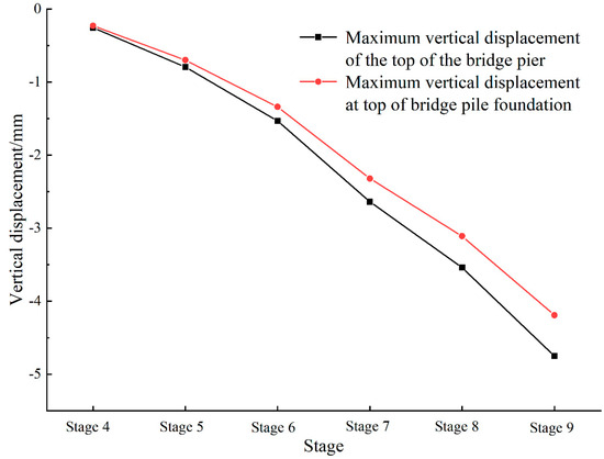 Maximum vertical displacement of the pier and pile foundation of elevated bridge A under different excavation conditions.