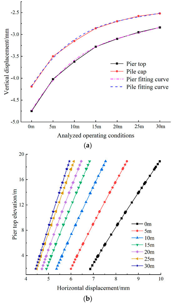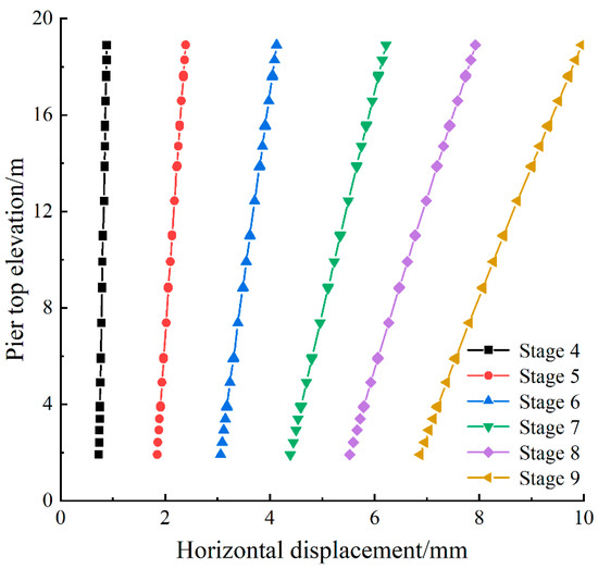 The horizontal displacement of pier A under different pre-applied axial forces is shown in Figure 16. As the pre-applied axial force increased, the horizontal displacement of pier A gradually decreased. A comparison of Figure 13b, Figure 15b and Figure 16b revealed that the change trends were consistent across the three cases. The tilt rate of the pier decreased from 0.018% without reinforcement to 0.012%, with a reduction of 33.33%.
