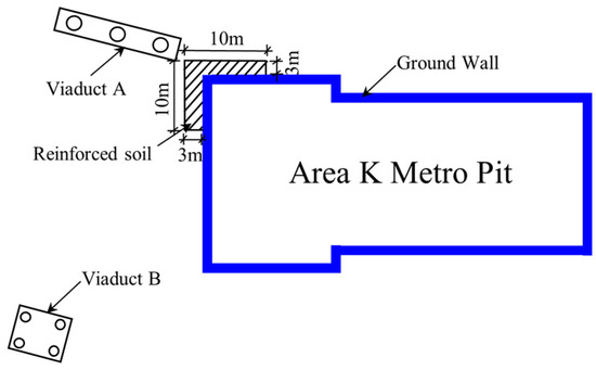 The aforementioned analyses confirmed that controlling the vertical displacement of the bridge piers is essential. Here, soil reinforcement outside the foundation pit was employed for optimization analysis. The reinforcement area primarily involved the soils around elevated bridge A. A 10 m long and 3 m wide “angle steel” type reinforcement zone was selected from the right-angle area near the end of elevated bridge A to facilitate the numerical study. The schematic diagram of soil reinforcement is displayed in Figure 12. Different reinforcement depths were studied to simulate the impact of foundation pit excavation on the adjacent elevated bridge, with simulation conditions detailed in Table 6.