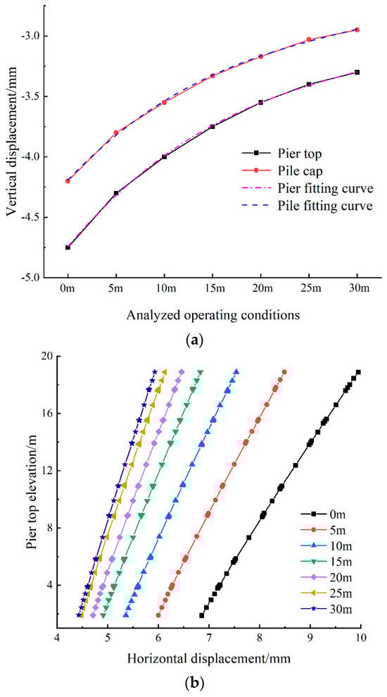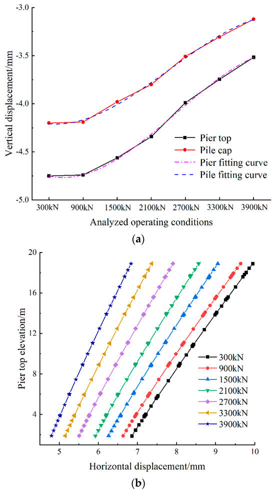 Figure 16 presents the maximum vertical displacement at the tops of piers and pile foundations, as well as the horizontal displacement of pier A under different pre-applied axial forces of the steel supports. It was observed from Figure 16a that as the pre-applied axial force of the steel supports increased, the maximum vertical displacement at the tops of piers and pile foundations gradually decreased, indicating that the greater the pre-applied axial force, the better the deformation control effect. The maximum vertical displacement at the pier top decreased from 4.75 mm without reinforcement to 3.52 mm, with a reduction of 25.89%, while that at the top of the pile foundation decreased from 4.19 mm without reinforcement to 3.12 mm, with a reduction of 25.53%. Further analysis of Figure 16a showed that at relatively low pre-applied axial force (less than 900 kN), an increase in pre-applied axial force had minimal impact on the maximum vertical displacement at the tops of piers and pile foundations. However, as the pre-applied axial force further increased (greater than 900 kN), its influence became significant. Within the studied range of maximum pre-applied axial force, the reduction in maximum vertical displacement was linearly related to the increase in pre-applied axial force. Compared to the optimized soil reinforcement scheme, increasing the pre-applied axial force was less effective, which was mainly due to the significant corner effects in the foundation pit. Considering the performance differences of equipment during construction, an appropriate pre-applied axial force should be selected based on the site conditions in actual construction. Polynomial fitting was utilized to model the maximum deformation of piers and pile foundations relative to pre-applied axial force, yielding the deformation versus pre-applied axial force curves, as shown in Equations (5) and (6), where the x-axis is the pre-applied axial force and the y-axis is the vertical displacement.