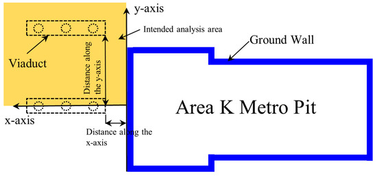 To further study the impact of foundation pit excavation on the deformations of piers and pile foundations of elevated bridges at different distances, the positional relationship between the pier and the foundation pit is analyzed, as illustrated in Figure 17. The model size, constitutive parameters, element type, and boundary conditions were consistent with those used for the finite element model in Section 3. Finite element modeling analysis was conducted by adjusting the horizontal distance between elevated bridge A and the foundation pit. The initial condition was that the right edge of the pier was 2 m from the subway foundation pit. Due to the spatial symmetry of the relative position between the pier and the subway foundation pit, analysis focused solely on the relative position of the upper half, which is located in the positive region of the x-axis and y-axis directions, as shown in Figure 17.