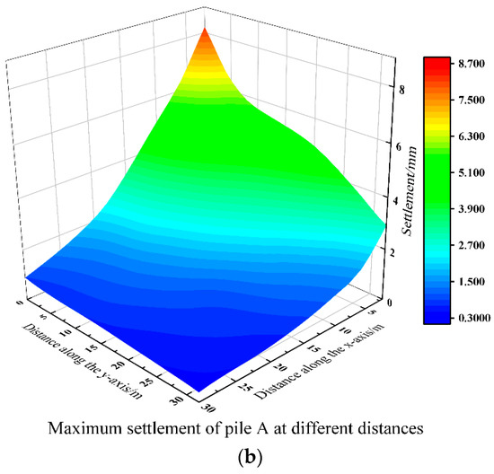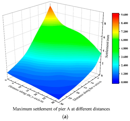 Maximum settlement cloud map of piers and pile foundations at different distances. (a) Maximum settlement cloud map of the pier. (b) Maximum settlement cloud map of the pile foundation.