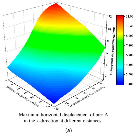 Maximum horizontal displacement of piers and pile foundations in the x-axis direction at different distances. (a) Maximum horizontal displacement of the pier in the x-axis direction. (b) Maximum horizontal displacement of the pile foundation in the x-axis direction.
