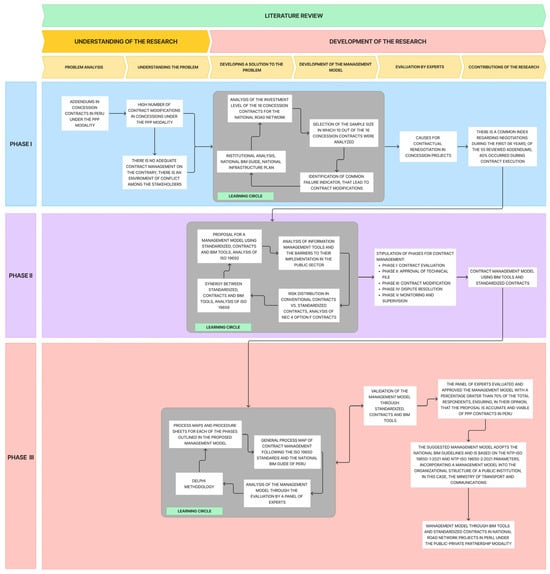 The analysis of the literature review and the diagnosis of the case studies, in this instance, the national road network under concession, made it possible to identify a synergy between information management tools and standardized contracts. This synergy was used to propose a management model that can optimize infrastructure under the PPP modality in the Peruvian context. Figure 2 summarizes the research design in a diagram.