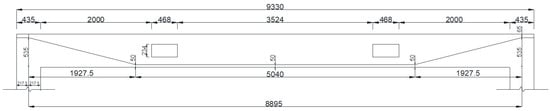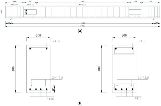 As shown in Figure 1, the perforated prestressed simply-supported concrete beam was used to verify the proposed surrogate-based finite element method enhanced by a deep learning technique. This concrete was 5000 mm in length and had a cross-section area of 200 mm × 400 mm, the distance between the two supports was 4600 mm. There were two symmetric open holes that were 400 mm × 160 mm in size along the mid-span of the beam at the belly of the beam, with equal heights of the upper and lower chord members at the opening positions. The size of the openings in the prestressed concrete frame was established with reference to examples in the literature [,]. Figure 1a presents the sectional dimensions of the beams and steel bars, and Figure 1b shows the left and right cross-sections of the beams.