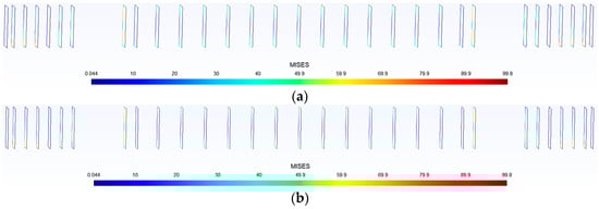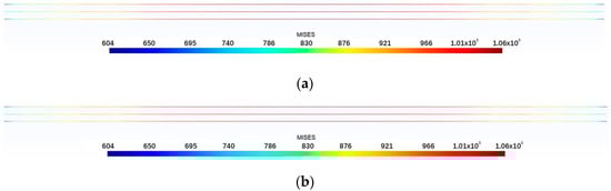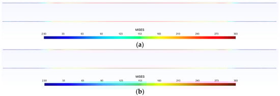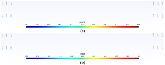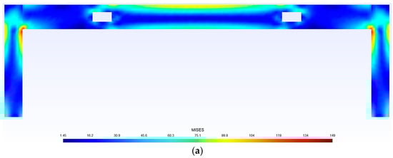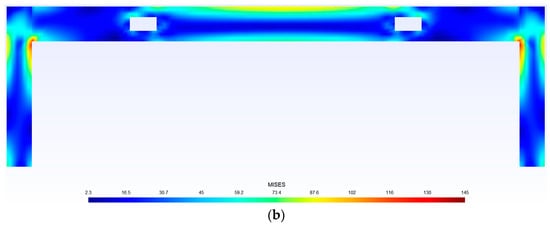 The stress field prediction results of some samples in the test dataset by the trained neural network are shown in Figure 5, Figure 6, Figure 7, Figure 8 and Figure 9. The stress distributions of von Mises stress values for 10,076 nodes, obtained through neural network predictions and an ABAQUS analysis, are plotted in Gmsh. From this figure, it can be seen that the structural stress distribution predicted by the trained neural network model is almost identical to the finite element analysis results. When training the neural network, it takes approximately 15 min to read the training dataset, test dataset, and all samples for 100 iterations, while using the trained neural network to predict the stress distribution of 2000 samples takes 0.1003 s. Compared to traditional finite element analysis methods, the computational time is greatly reduced. These figures indicate that the error of the proposed neural network model is less than 0.1. Thus, it is demonstrated that the proposed surrogate-based finite element method enhanced by a deep learning technique is efficient and accurate.