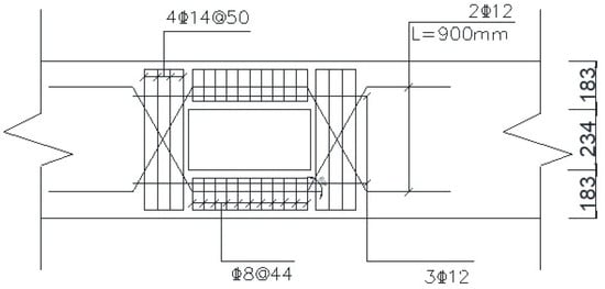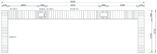 As shown in Figure 10, Figure 11, Figure 12 and Figure 13, the perforated prestressed concrete frame was analyzed using the proposed surrogate-based finite element method enhanced by a deep learning technique. The prestressed concrete perforated frame had a span width of 8460 mm, was 2770 mm in height, a beam cross-section area of 235 mm × 600 mm, and a column cross-section area of 265 mm × 435 mm. There were two symmetric open holes that were 468 mm × 234 mm in size along the mid-span of the beam at the belly of the beam, with equal heights of the upper and lower chord members at the opening positions. The distance of the openings in the prestressed concrete frame was established with reference to examples in the literature [,]. Figure 10 presents the sectional dimensions and steel bars, Figure 11 shows the reinforcement around the opening of the frame, Figure 12 shows the cross-sections of the beam and the column of the frame, and Figure 13 illustrates the layout of the line-shaped prestressed steel bars. The frame dimensions, beam and column sections, position and quantity of column stirrups and longitudinal bars, line type and quantity of prestressing bars, position and quantity of the beam’s longitudinal bars, and position and quantity of the reinforcement around the openings were kept the same. Numerical experiments were made for the frame structures with different opening positions and under different loading conditions.