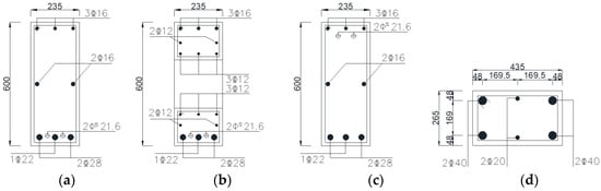 Reinforcement around the opening of the frame at (a) the middle point of the beam; (b) the opening; (c) the end-point of the beam; and (d) the top of the column.