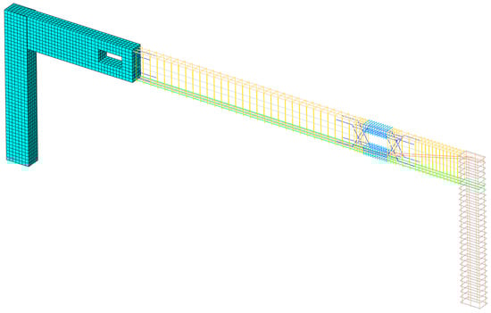 In order to balance the accuracy and efficiency of the calculation and to avoid a severe distortion of the mesh around the prestressed steel bars at the beam’s end, the relevant finite element model adopts eight-node hexahedral reduced integral elements (C3D8R) to simulate the concrete part. Ordinary steel bars and prestressed steel bars mainly bear tensile and compressive forces in concrete components, so truss elements (T3D2) are used for simulations. The grid size of the concrete unit was about 40 mm, with 10 grids along the direction of the beam’s height and 5 grids along the direction of the beam’s width. The grid size of the ordinary steel bars and prestressed steel bars was about 80 mm. The finite element model after mesh generation is shown in Figure 2, and the mesh information of every component is shown in Table 1.
