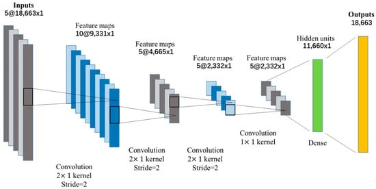 The first three channels of the input of the convolutional neural network were the x, y, and z coordinates of 18,663 nodes, the fourth channel was the node load of each node, and the fifth channel was the reinforcement area of each node. The node area of the concrete unit was set to 0, and the node area of the steel bar unit was inputted according to the actual value. The first hidden layer was a convolutional layer containing 2 convolutional kernels and a ReLU activation function, with a stride of 2. The output feature map size was 9331, and the number of output channels doubled. The second hidden layer was a convolutional layer containing 2 convolutional kernels and a ReLU activation function, with a stride of 2, an output feature map size of 4665, and half of the number of output channels. The third hidden layer was a convolutional layer containing 2 convolutional kernels and a ReLU activation function, with a stride of 2. The output feature map size was 2332, and the number of output channels was equal to the number of input channels. The fourth hidden layer was a convolutional layer containing 1 convolution kernel and a ReLU activation function, with a stride of 1. The output feature map had the same size as the input feature map, and the number of output channels was equal to the number of input channels. The fifth hidden layer was the flattening layer, which converts a 4-dimensional input into a 2-dimensional output. Finally, the fully connected output layer outputted 18,663 node displacements. Figure 15 presents the convolutional neural network with five hidden layers.