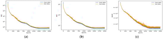The batch size for neural network training was 256, and the Adam optimizer was used for parameter updates. The loss function was the MSE, and the learning rate was set to 0.00005. The biases were all 0, and the epochs were 2000. Figure 16a–c present MSE, MAE, and SMAPE curves in logarithmic coordinates respectively. The results indicate that the proposed neural network can reliably converge. Each sample in this experiment had 18,663 nodes. The time required to read the training dataset, test dataset, and all samples for 2000 iterations when training a neural network was approximately 3 h. The time required to predict the displacement distribution of 5000 samples using the trained neural network was 7.4462 s. The calculation time was significantly reduced compared to traditional finite element analyses.