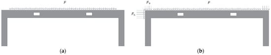 The perforated prestressed concrete frame with an opening distance of 3524 mm under two different loadings: (a) only a vertical randomly distributed loading on the beam and (b) both a vertically distributed loading on the beam and a horizontal loading on the top-end area of the left column.