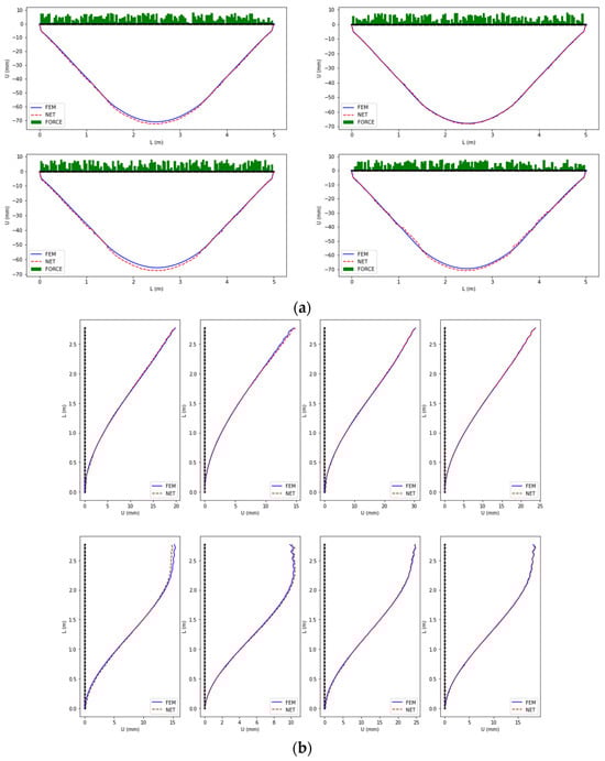 The vertical and horizontal deflections of the perforated prestressed concrete frames under two different loadings were analyzed using the proposed deep learning technique and the conventional finite element method. Figure 22 presents the two different loadings. Figure 22a shows only a vertical randomly distributed loading on the beam, and Figure 22b expresses both a vertically distributed loading on the beam and a horizontal loading on the top-end area of the left column. Figure 23a presents the vertical deflection of the beam under a vertical randomly distributed loading, and Figure 23b shows the horizontal deflection of the left column under both a vertical arbitrarily distributed loading on the beam and a horizontal loading on the top-end area of the left column. These figures indicate that the error of the proposed neural network model is less than 0.1. Thus, it is demonstrated that the proposed surrogate-based finite element method enhanced by a deep learning technique is efficient and accurate.