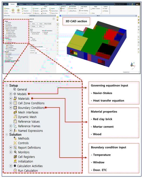 Table 2 shows the equations used to measure the increase or decrease in indoor temperature due to the outdoor temperature by implementing natural ventilation. This equation is a formula for basic laws such as conservation of mass, momentum, energy, species, etc., and these equations (Navier–Stokes equation and the heat transfer equation) are entered in the “Model” item in