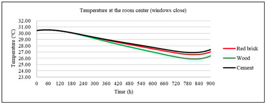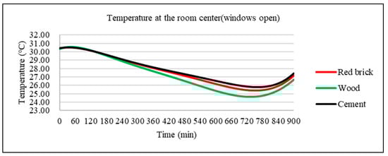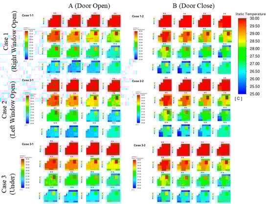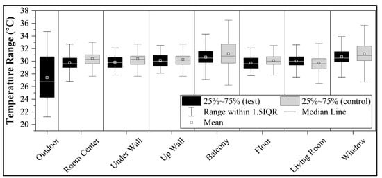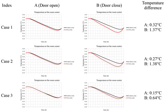 Since this experiment uses commuting hours to analyze the effect of daytime outdoor air on the building’s thermal comfort and cooling load and its effect on insulation performance materials, the window opening and closing time was the same as the office commuting time. Therefore, the window was opened at 6:00 p.m., the window was closed at 9:00 a.m. the next day, and collection of the data up to 6:00 p.m. was performed as one cycle. To minimize data errors, one experiment included three consecutive cycles of data. A buffer period of at least one day was allowed between each experiment to prevent data interference. Since the purpose of the buffer section is to unify the data of each experiment and the heat storage amount of the material inside the building and increase data reliability, the opening and closing of the window in the buffer section was carried out in the same manner as the next experiment