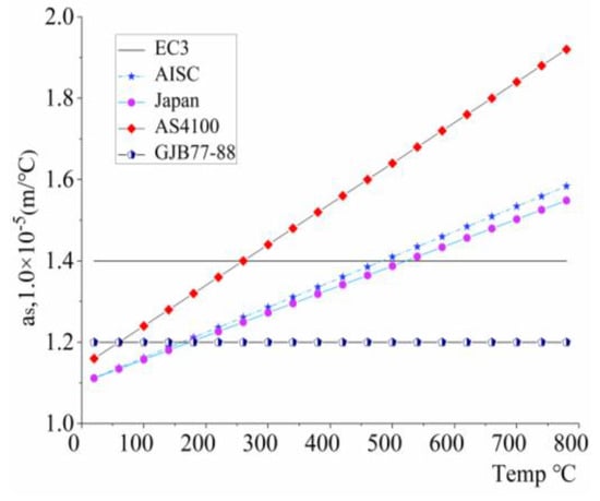 The coefficient of thermal expansion mainly affects the deformation and thermal expansion of steel structures. The calculation methods of the thermal expansion coefficient at high temperature given by scholars from various countries are very different, as shown in Figure 1.