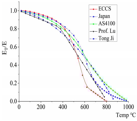 Before the temperature is 300 °C, the elastic modulus coefficient of steel changes very little. When the temperature reaches 300 °C, the elastic modulus of steel decreases significantly with the increase in temperature. When the temperature rises to 400 °C, the elastic modulus decreases by about 60%. When the temperature reaches 600 °C, the structure loses the bearing capacity. The formulas for calculating the reduction coefficient of elastic modulus obtained by scholars from various countries through statistical analysis and regression have certain differences, as shown in Figure 2. Among them, Tongji University gives the calculation method as follows.
