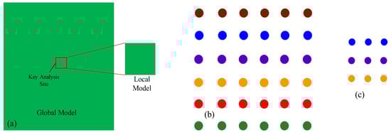 Although PD theory makes up for many shortcomings of traditional methods in solving structural damage problems, the calculation time consumed by PD theory is proportional to the number of PD particles in the process of solving. When PD theory is used to analyze relatively large model problems, as shown in Figure 4a, objects need to be discretized into a large number of particles, as shown in Figure 4b, and the PD calculation process needs to consume a lot of time. At present, PD theory mainly solves problems in the field of small models. In order to reduce the time-consuming problem of solving large models, key parts are usually taken out of the overall model to establish a local model for analysis, as shown in Figure 4a, and the local model is scattered into PD particles, as shown in Figure 4c. In this way, the number of PD particles will be greatly reduced, and the time consumed in the process of PD theoretical analysis will be very small.