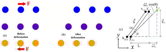 Two-dimensional plane pure shear problem. (a) Before deformation; (b) After deformation; (c) Computational analysis model.