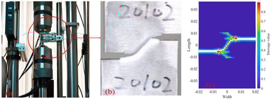 A Q345 steel material with elastic modulus , Poisson’s ratio , ultimate strength , and density was tested at room temperature. The MTS809 hydraulic testing machine was used to carry out the tensile failure test of the double-sided crack specimen with a longitudinal spacing of 10 mm, and the PD theoretical simulation results were compared and verified, as shown in Figure 7. Figure 7a is the loading device of the test hydraulic equipment, Figure 7b is the crack growth path and fracture results of the test specimen, and Figure 7c is the damage and crack growth results of the specimen under the same conditions analyzed by PD theory. The test and simulation results of specimen in Figure 7b,c are completely consistent, indicating that PD theory can accurately simulate structural damage and failure.