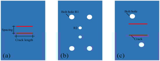 Specimen model of central crack and bolt hole. (a) Crack; (b) bolt holes; (c) cracks and bolt holes.