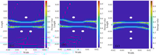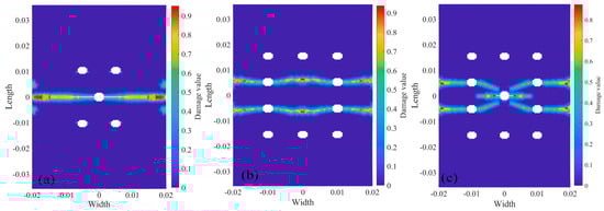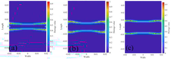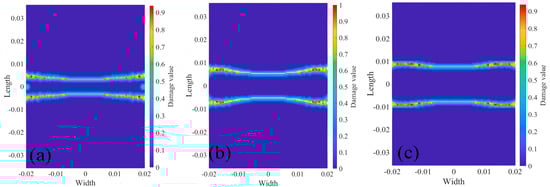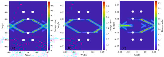 Figure 14 shows the structural damage and failure characteristics of a Q345 steel plate with six bolt holes with a 3 mm diameter and at different positions under a tensile displacement load of . Figure 14a shows the steel plate with a central symmetry and six bolt holes. The bolt holes are distributed in equilateral triangles, and the damage and failure path under a load are presented. At the initial stage of loading, the damage first occurred in the middle region of the left and right sides of the specimen, and the center developed symmetrically towards the center and both sides of the specimen, forming two scissor-shaped crack propagation paths of the same size. Figure 14b shows the inclined symmetrical steel plate with six bolt holes, the bolt holes distributed in a right triangle, and the crack propagation path under the action of load. At the initial stage of loading, the damage first occurred on both sides of the symmetric edges of the left and right center of the specimen and gradually expanded diagonally in the X and Y directions of the specimen, and the crack growth rate corresponding to the direct hyluse of the triangle was faster than that corresponding to the right angle of the triangle, and finally, a parallelogram crack growth path was formed. Figure 14c shows a steel plate with six bolt holes symmetrically positioned about the X-axis, and the bolt holes are symmetrically distributed along the X-axis in a right triangle. Under the action of a tensile load, damage occurs first at the X-axisymmetric position on both sides of the specimen. With the application of a load, the damage area gradually expands symmetrically along the X-axis, and the crack growth rate corresponding to the hypersonic side of the triangle is faster than that corresponding to the right-angle side. Finally, a large and small scissor-shaped crack growth path is formed. According to the damage and crack propagation paths of bolt hole specimens at different positions, the crack tip extends towards the nearest bolt hole in the process of damage and crack propagation.