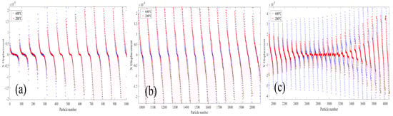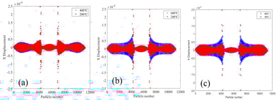 Different from the PD particles’ X-direction displacement of the specimen in Figure 11, Figure 12 shows the PD particles’ displacement with the serial number ranging from 0 to 4000 oscillation characteristics during the PD particles’ X-direction displacement change at 200 °C and 600 °C. It can be seen from Figure 12a that when the displacement of PD particle in the X direction is relatively small, the displacement of PD particle near the Y axis of the specimen oscillates in the X direction, and the displacement oscillation of PD particle decreases as the displacement of PD particle in the direction increases. Figure 12b shows the amplified effect diagram of PD particle displacement in the X direction with the serial number ranging from 1000 to 2000. The PD particle displacement in the X direction of this part is large, so the PD particle displacement in the X direction near the Y axis of the specimen does not oscillate. Figure 12c shows the amplification effect of PD particle displacement in the X direction with the serial number ranging from 2000 to 4000. It can be clearly seen that PD particle displacement in the X direction is large when the temperature is high. When the PD particle displacement in the X direction of the specimen changes from small to large, the PD particle displacement oscillation in the X direction near the Y axis of the specimen disappears. By synthesizing Figure 12, it can also be concluded that temperature has a great influence on the displacement oscillation of the PD particle in the X direction near the Y axis of the specimen, and the displacement oscillation of PD particle in the X direction is significantly stronger under low-temperature conditions than under high-temperature conditions. This is because the strength of steel at low temperature is higher, the strength of material resistance to external load is larger, and most of the material is plastic deformation and prone to plastic yield, so the PD particles’ oscillation at low temperature is significantly stronger than that at high temperature.