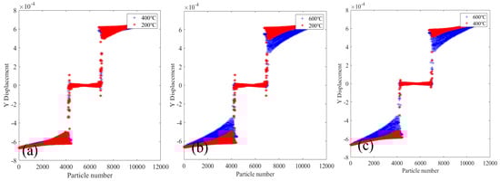 Figure 13 shows the change rule of displacement in Y direction of specimen C1015x under a load with temperature at 200 °C, 400 °C, and 600 °C. It can be seen from Figure 13 that under load, the Y-direction displacements in the upper and lower regions of the central crack of the specimen gradually decrease from the two ends of the specimen to the middle, and the Y-direction displacement of PD particle in the central crack region of the specimen is almost 0 mm. By comparing the displacement of the PD particle in the Y direction at different temperatures, it can be seen that the displacement of PD particles in the Y direction is smaller when the temperature is higher.