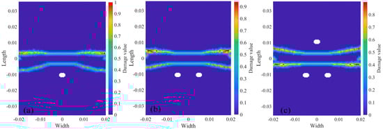 Figure 16 shows the central double-crack specimen with one screw hole, two screw holes, and three screw holes. The displacement load was applied to both ends of the specimen, and the influence characteristics of the number of screw holes on the central double-crack propagation mechanism were analyzed. In Figure 16a, the specimen contains a screw hole, and the center coordinate of the screw hole is O1 (0.00, −0.01). Under the action of the load, the upper central crack expands horizontally, while the lower central crack expands along a similar path to that of the specimen without a screw hole. However, the damage value of the upper central crack tip is higher than that of the lower central crack tip. In Figure 16b, the specimen contains two bolt holes, and the center coordinates of the bolt holes are O1 (0.005, −0.01) and O2 (−0.005, −0.01). Under the load, the central double-crack growth path is almost similar to that of the specimen without screw holes, but the crack growth rate and damage value in the upper center are significantly higher than those in the lower center. In Figure 16c, the specimen contains three bolt holes, and the center coordinates of the bolt holes are O1 (0.005, −0.01), O2 (−0.005, −0.01), and O3 (0.00, 0.01). Under the load, the lower crack expands in the horizontal direction, and the upper crack propagation path is consistent with that of the central crack without a screw hole.