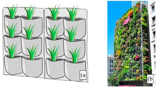 A suitable implementation of a living plant system integrated with the building envelope is represented by living walls (LWs), made of light support structures that do not interfere with the building static to allow plants to grow even without being rooted into the ground []. Plants can be pre-cultivated and subsequently implemented in the LW, providing varied designs and more options [,]. LWs are suitable for the retrofitting of existing buildings, especially in the presence of continuous opaque facades, maintaining low installation costs. There are two main types of LWs: continuous and modular systems [,,,]. The continuous LW system (Figure 1a) is composed of two layers of synthetic fabric. The external layer, usually made of felt or plastic sheets, consists of a pocket-shaped container that is filled with a planting medium and is used to favour the plants rooting. The internal layer is a waterproof membrane to preserve building facades from water and high moisture. The layers are supported by a framework directly fixed to the building wall. The modular systems (Figure 1b) are composed of containers in different shapes and sizes and hold the growing media to support the vegetable species. They can be in the form of framed or planter boxes, planter tiles, bags, vessels or trays. The water and nutrients are distributed to the plants through the growing media at different levels along the wall by gravity [].