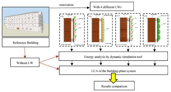 In recent years other investigations have analyzed different materials and shapes targeted to maximize environmental benefits. The focus of these studies was mainly the evaluation of the materials sustainability for the LW implementation influencing the inhabitant’s well-being, energy, water consumption and interaction between the buildings’ conditions with the site factors. In order to better consider this relationship, the LCA of the whole-building LW system is strictly required, considering the embodied impacts of all the elements. Since this aspect is still missing in the relevant literature, this study evaluates the environmental performance of four different LW solutions, focusing on the buildings’ sustainability through a combination of energy analyses and system LCA. In particular, the work is planned to follow the scheme depicted in Figure 2. Starting from a reference real building, the LWs were first analyzed in terms of energy performances by determining heating and cooling demands in the specific site. Subsequently, the association of the LCA results, for which a basic flow diagram is depicted in Figure 3, has allowed for obtainment of a more exhaustive framework of the building’s environmental impact. To quantitatively measure the enhancement achievable in terms of building sustainability, the results were compared with those provided by the reference building without LW, which was set as the benchmark.