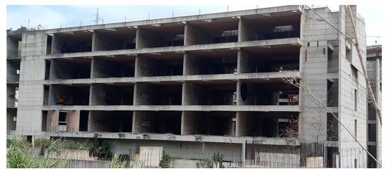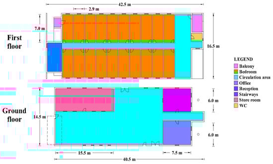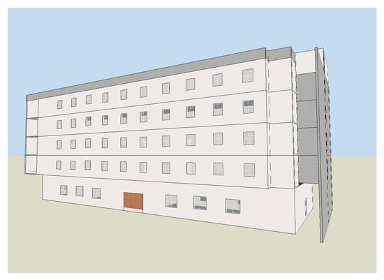These evaluations were carried out by referring to the case study depicted in Figure 4, representing an under-construction university four-floor housing project made of a steel concrete load-bearing structure. The building is located in Reggio Calabria (38°07′21.4″ N 15°39′45.2″ E), belonging to the Csa zone following Koppen classification, and geometrically modelled by the .idf file generated in the DesignBuilder (DB) environment shown in Figure 5. The building will host a student accommodation equipped with hall and service areas on the ground floor and 20 student bedrooms for each floor above ground, following the scheme of Figure 6.