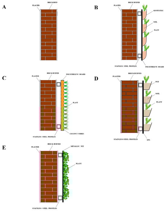 Schematic diagrams of the investigated LW systems: (A) bare brick wall (without LW); (B) brick wall with geotextile layer forming pockets; (C) brick wall with module filled with coconut fibres substrate; (D) brick wall with planters made in polypropylene; (E) brick wall with continuous metal (aluminium) rails for clinging plants like ivy.
