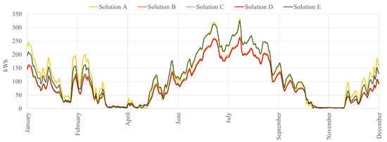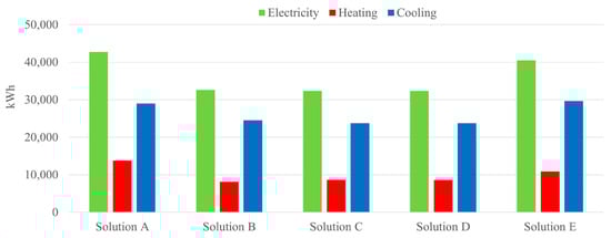 The energy analysis highlights the benefits achievable in terms of energy savings and the control of the indoor air temperature within the well-being range using LWs (Figure 8). Solution B shows the best performance in the winter, allowing for the minimization of the heating demand (8125 kWh), corresponding to a saving of 40% more than the benchmark value. On the contrary, solution D offers the best performance in the summer, with a cooling demand of 23,737 kWh, corresponding to a saving of 18% more than the benchmark value.