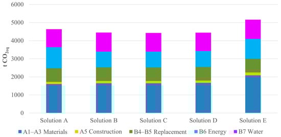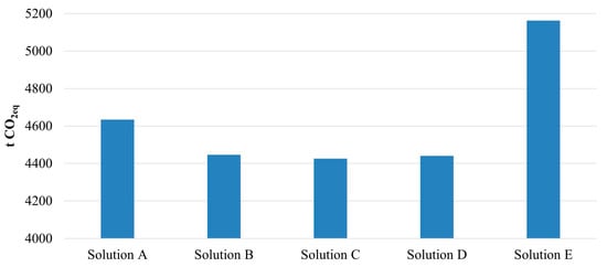 The comparison among the LCA of the different LW systems is shown in Figure 10, highlighting solution C as the LW that impacts the environment the least, with a global warming potential of 4.426·103 t of CO2eq. On the contrary, solution E produces the greatest global warming potential with a value of 5.163·103 t of CO2eq, which is worse than the benchmark, considering that its value is equal to 4.634·103 t of CO2eq.