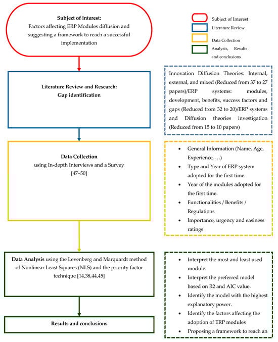The survey was distributed via email and LinkedIn to reach a diverse audience of general managers, project managers, and end-users in construction companies. Targeted distribution efforts included contacting companies in developing countries, mainly in Africa and the ME regions, and using LinkedIn to identify potential respondents. A list of employees’ emails is shared by several managers of construction companies through direct contact while a search on LinkedIn by keyword: ERP, Construction is completed to reach the maximum number of respondents. By making it possible to compare the group of potential respondents with the people who took part in the survey, the employee lists that the companies offer help assess the validity of the findings. This ensures that the final sample is representative of the intended population and aids in identifying any anomalies, such as non-response bias. Emails that were not on the supplied list were cross-referenced on LinkedIn to confirm the respondent’s legitimacy and authenticity. Spreading the survey online allows the flexible design of various question types, reduces the cost, and releases the necessity of being present on-site. Since the construction industry is unique and cannot be standardized, collecting data to identify the users’ characteristics of ERP systems helps deliver realistic data [37] and credible results [38,39]. Figure 1 sketches the methodology adopted in this study.