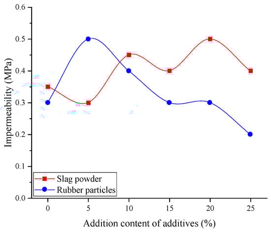 - Adding more than 10% slag powder improves the impermeability of the mortar. When the slag powder content ranges from 0% to 20%, the mortar test blocks exhibit a steady increase in seepage pressure, rising from 0.35 MPa to 0.5 MPa, a 42.9% increase. A small amount of rubber particles can also enhance impermeability, but excessive rubber content reduces it. The impermeability pressure increases from 0.3 MPa to 0.5 MPa, but it then decreases from 0.5 MPa to 0.2 MPa as the rubber content increases from 5% to 25%.