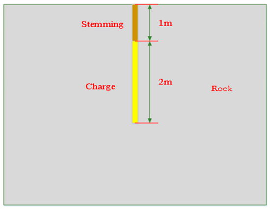 The numerical model had a length of 30 m and a height of 25 m, in which the blast was located in the center and the diameter of the blasting hole was 40 mm, which is the same as the diameter of the charge. The length of the charge was 2 m, and the length of the blocked section of the blasting hole was 1 m. The upper part of this model was the critical surface, the left part, the right part, and the lower part of this numerical model were the bedrock, and all boundaries were non-reflective boundaries. The model is shown in Figure 1.