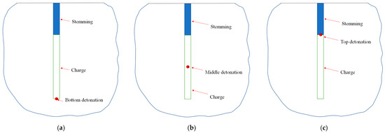 Some researchers have shown that the location of the initiation point on the blast vibration has a significant impact. Studies have shown the strip packages in the detonation point after the detonation, and the blasting wave will propagate along the direction of the package axis; after a certain period of time, the entire package completes the blast. Due to the geometric properties of the packet in the blasthole and the explosive blast velocity of the finite, along the packet axis, there are time and direction effects. In engineering practice, there is general use of top detonation, bottom detonation, and midpoint detonation. The top detonation of the initiation point is located in the mouth of the blasthole, and for the lower part of the blasthole, the rock fragmentation effect is better. However, due to the proximity of the upper free surface, if the blasting process is not yet over, there is a weak reflection of the tensile stress wave, the resulting fissure allows for the escape of blasting gas to create a channel, and the strength of the reflected wave is not enough to break the rock, making it easy to form a large piece of rock. The bottom detonation of the initiation point is located at the bottom of the blasthole, and due to the full effect of the reflected tensile stress waves, the upper part of the blasthole rock damage is wider, which is more effective, but the bottom of the blasthole rock fragmentation effect is poor. The midpoint initiation point is located in the middle of the package, as the upper and lower rocks have a good fragmentation effect; therefore, there is destruction of a more uniform area, but its damage range is smaller. From the simulation results, we know that the location of the initiation point determines the propagation direction of the blasting wave, which causes different blasting vibration responses [38]. In this study, bottom detonation, midpoint detonation, and top detonation were simulated, and we analyzed the effect of the location of the initiation point on the damage evolution process and impact damage range. The initiation locations are shown in Figure 2.