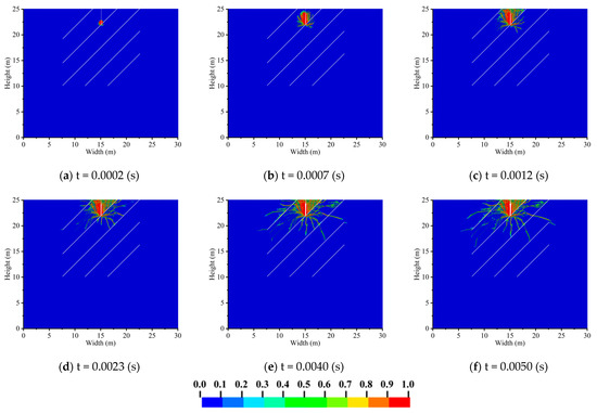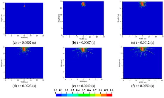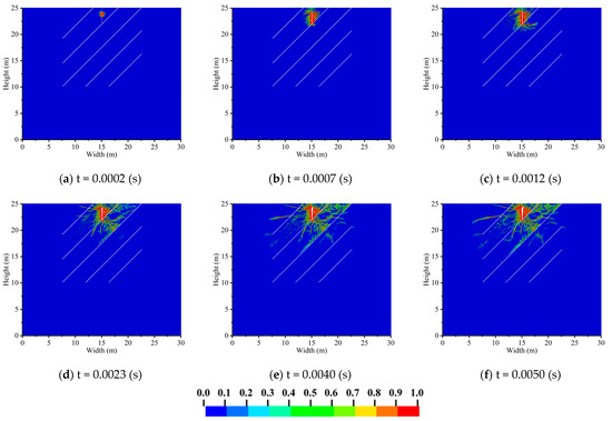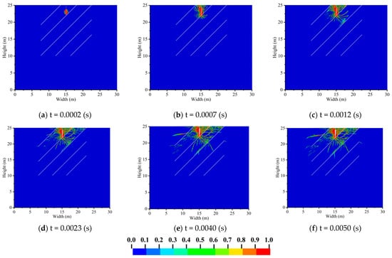 When the charge was detonated at the top of the blasthole (Figure 6), the blasting high-energy zone and high-stress zone appeared at the bottom of the hole, and when the stress wave arrived at the joint, part of that was reflected and absorbed; therefore, the energy of the stress wave attenuated rapidly and damage parallel to the joint appeared on the side facing the wavefront. When the stress wave propagated from the bottom of the blasthole, the reflected tensile wave was generated along the wavefront of the joint surface and propagated downward along the joint’s inclined plane, inducing damage and failure depth of the rock mass greater than that of the intact rock mass. However, the damage range in the horizontal direction was smaller than that of the intact rock because the joint absorbed part of the energy of the stress wave; therefore, the damage was mainly distributed in the layered rock where the blasthole was located and the rock layer near the blasthole.