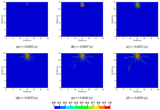 When the charge was detonated at the top of the blasthole, the shock wave and stress wave propagated from the top to the bottom and a high-energy region appeared at the bottom of this blasthole. From the beginning of the damage evolution process (Figure 5a) to the end (Figure 5e), the damaged area gradually formed an inverted funnel shape, and the rock at the bottom of the blasthole was subjected to a stronger collapsing load while the compression damage around the hole was obviously less and mainly in the form of shear damage and tensile damage, which was prone to large rock masses [41]. Using this detonation method, the damage at the hole mouth was not sufficient and there was a great possibility of leaving large rock masses. The damage to the rock at the bottom of the hole was too large and therefore not easy to handle, adding engineering safety hazards.