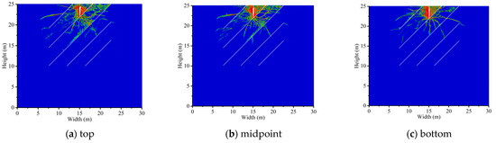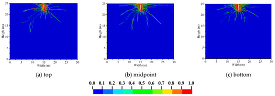 Figure 11 shows that the damage to rock mass with layered joints was subjected to blasting loads with different locations of the initiation point. Figure 11a shows top detonation, Figure 11b shows midpoint detonation, and Figure 11c shows bottom detonation. When there are layered joints, due to the different wave impedances, multiple reflections and transmissions will occur on the upstream and downstream surfaces of multiple layered joints, changing the propagation path of the stress wave, causing the energy carried by the stress wave to dissipate, thus leading to the asymmetry of the damage distribution. In the layered rock near the blasting source, the damage to the rock mass at the bottom of the blasthole is mainly concentrated in the rock mass less than 90° away from the direction of the vertical layered fractures.