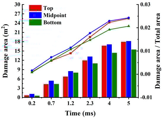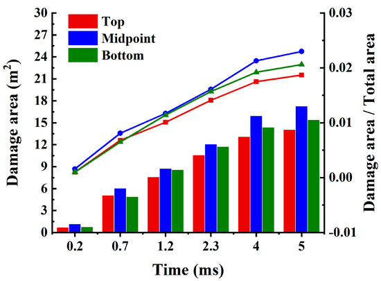 Utilizing MATLAB software (R2022b), we have developed a program that calculates the damaged area of intact rock at different time points using different locations of initiation points. The results are presented in Table 3 and illustrated in Figure 10.