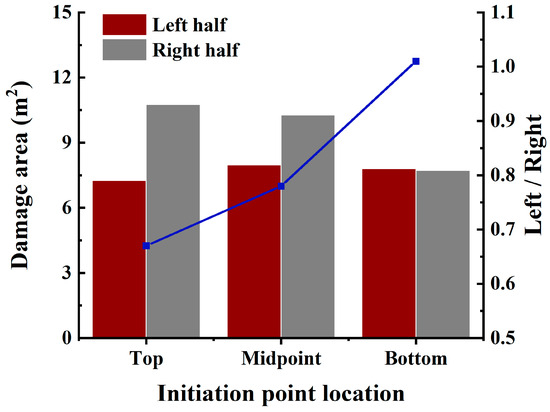 Figure 13 illustrates the damage areas on the left and right halves of the blasthole for different initiation points, as well as the ratio between the two. Under both top and midpoint initiations, the damage area on the left half is approximately 7.5 m2, significantly less than the 10.5 m2 on the right half. For bottom initiation, the damage areas on both sides of the blasthole are approximately 7.7 m2. Considering the ratio of damage areas on both sides of the blasthole, the top initiation has a ratio of 0.67, which is lower than 0.78 for midpoint initiation, indicating greater asymmetry in the damage distribution for top initiation. The bottom initiation exhibits the most uniform damage distribution, with a ratio of 1.01. The layered joints are oriented at a counterclockwise 45° angle to the horizontal axis, located below the blasthole, and are able to fully interact with the downward-propagating blasting stress wave during top initiation, resulting in reflective tensile actions that concentrate damage primarily in the normal direction of the layered joints. With midpoint initiation, only a portion of the stress wave propagates downward, while with bottom initiation, the stress wave propagates upward, leading to a more symmetrical damage distribution.