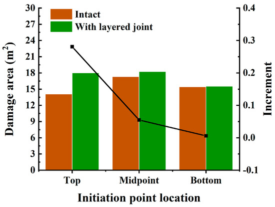 Figure 14 shows the damage areas and their corresponding increments for intact rock and rock with layered joints at different initiation points. For top initiation, the presence of layered joints significantly enhances the blasting fragmentation effect, improving it by 28.09% compared to intact rock. The distribution of layered joints has a certain impact on the fragmentation effect of midpoint initiation, with the damaged area increasing from 17.28 m2 for intact rock to 18.23 m2. With bottom initiation, the damaged areas of the two types of rock differ by only 0.59%.
