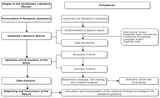 An SLR is used in this research to meet the research objectives by engaging closely with existing publications, providing detailed insights, and fostering the development of new knowledge. An SLR is an in-depth research method that employs predetermined strategies to review and analyze previous studies [31,32] systematically. This approach addresses specific research questions by carefully selecting and evaluating relevant studies, synthesizing the gathered data, and presenting the findings in a structured manner that allows the researcher to draw insightful conclusions [17]. Conducting an SLR involves several key steps: (1) determining the research questions, (2) locating and searching relevant literature, (3) selecting studies, (4) analyzing and synthesizing the data, and (5) reporting and interpreting the results. A summary of the research methodology is presented in Figure 1. The first stage involves establishing research questions to help achieve the objectives of the SLR.