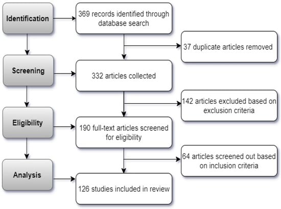 All stages of this process are illustrated in Figure 2, using the Preferred Reporting Items for Systematic Reviews and Meta-Analyses (PRISMA) flow diagram as outlined by [39]. The PRISMA flow diagram is widely utilized in systematic reviews and meta-analyses to illustrate the research selection process. It effectively represents each stage of inclusion and exclusion, clearly summarizing how articles were identified, screened, and selected. It comprises four key phases: identification, screening, eligibility, and analysis (studies included in the review), as recommended by [40]. This diagram provides a well-defined representation of the literature search and filtering procedure.